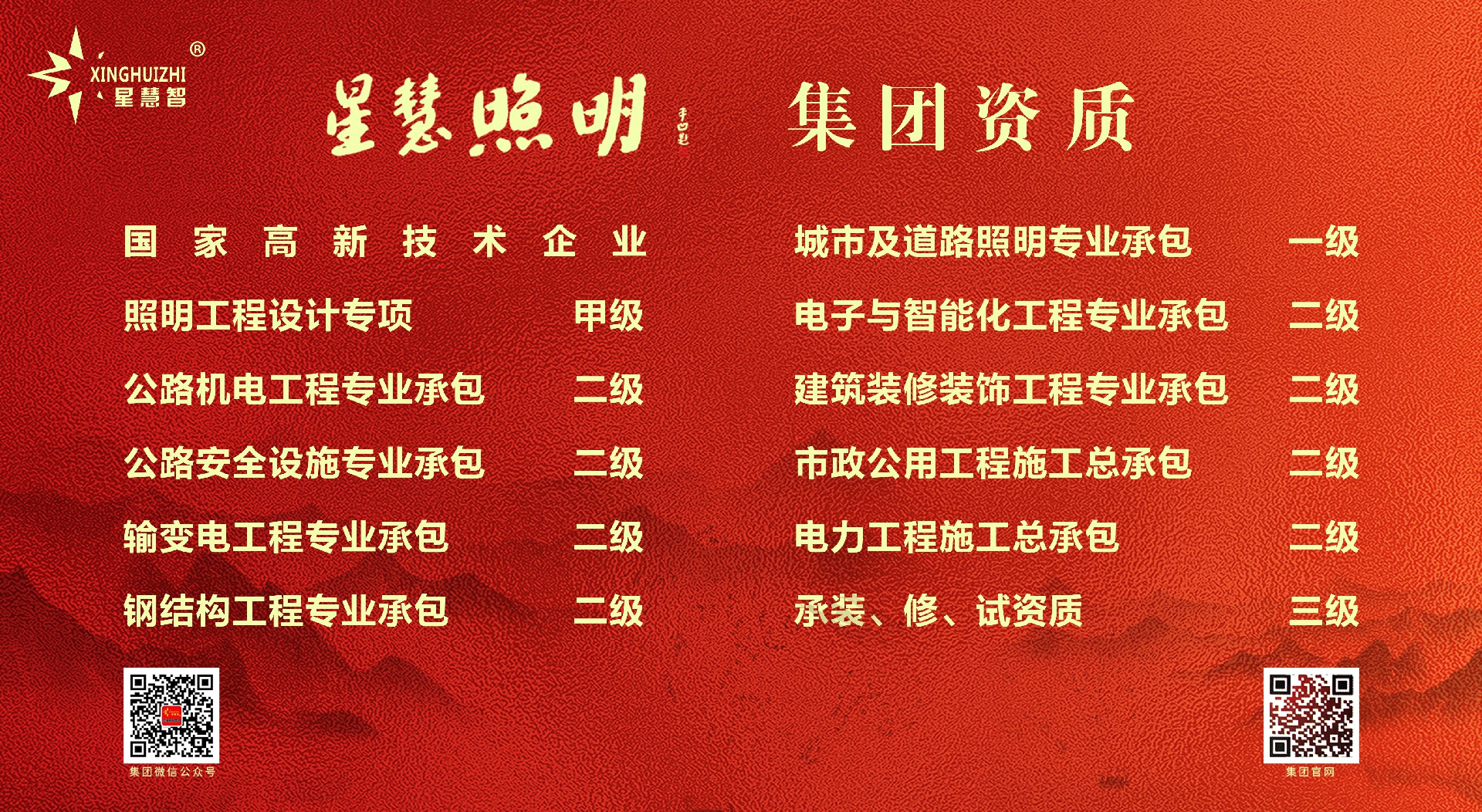 星慧照明工程集團(tuán)有限公司坐落在中國路燈制造基地:江蘇省高郵市送橋鎮(zhèn)天山工業(yè)園區(qū)星揚(yáng)路。公司成立于1999年,注冊資金5058萬元,廠區(qū)占地8萬多平方米,建筑面積6.5萬多平方米,主要下轄三大功能生產(chǎn)廠區(qū)和兩處商務(wù)運(yùn)營中心及集團(tuán)行政總部,是一家集科研、設(shè)計(jì)、生產(chǎn)、銷售、施工服務(wù)為一體的大型戶外照明產(chǎn)品制造商和集成運(yùn)營商。星慧照明工程集團(tuán)資質(zhì)實(shí)力雄厚,目前擁有“城市及道路照明專業(yè)承包一級資質(zhì)”、“照明工程設(shè)計(jì)專項(xiàng)甲級資質(zhì)”、“電子與智能化工程專業(yè)承包二級資質(zhì)”、“公路安全設(shè)施專業(yè)承包二級資質(zhì)”、“公路機(jī)電工程專業(yè)分項(xiàng)承包二級資質(zhì)”、“建筑裝修裝飾工程專業(yè)承包二級資質(zhì)”、“市政公用工程施工總承包二級資質(zhì)”、“鋼結(jié)構(gòu)工程專業(yè)承包二級資質(zhì)”、“電力工程施工總承包二級資質(zhì)”、“輸變電工程專業(yè)承包二級資質(zhì)”、“承裝(修、試)”三級資質(zhì)。公司榮幸被評為省重合同守信用企業(yè)、省質(zhì)量信得過企業(yè)、AAA級資信企業(yè),并成功通過ISO9001:2015質(zhì)量體系認(rèn)證、ISO14001:2015環(huán)境體系認(rèn)證、“CE”認(rèn)證及“CCC”及“CQC”國家強(qiáng)制性產(chǎn)品認(rèn)證、中國節(jié)能產(chǎn)品認(rèn)證。公司成立江蘇省研究生工作站,并先后榮獲江蘇省名牌產(chǎn)品、省著名商標(biāo)、高郵市市長質(zhì)量獎、揚(yáng)州市百強(qiáng)民營企業(yè)等榮譽(yù)證書,被江蘇省認(rèn)定為企業(yè)技術(shù)中心,并順利通過安全生產(chǎn)標(biāo)準(zhǔn)化二級企業(yè)驗(yàn)收并取得證書,為企業(yè)的跨越性發(fā)展打下健康穩(wěn)健的基礎(chǔ)!集團(tuán)公司的產(chǎn)品主要包括:智慧